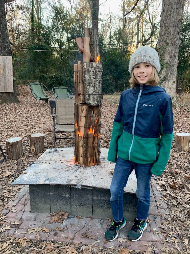 Noah is our king of fires (or “pires,” as we still call them since that was his word as a toddler). We don’t burn Christmas trees on New Year’s Eve anymore after our run-in with the fire department several years back. So Steve built Noah a log tower for our birthday s’mores, and he approved.