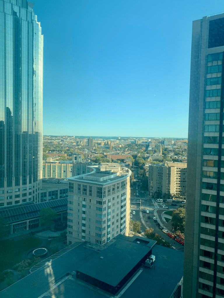 We took a Lyft to our hotel, the Sheraton in the Back Bay neighborhood of Boston, selected for its affordability and walk-ability. The hotel is under renovation and we were thankful to get one of the newly-renovated rooms up on the 22nd floor, where it was nice and quiet. We also had a view of the Charles River. We dropped our things and freshened up before setting back out for the evening.