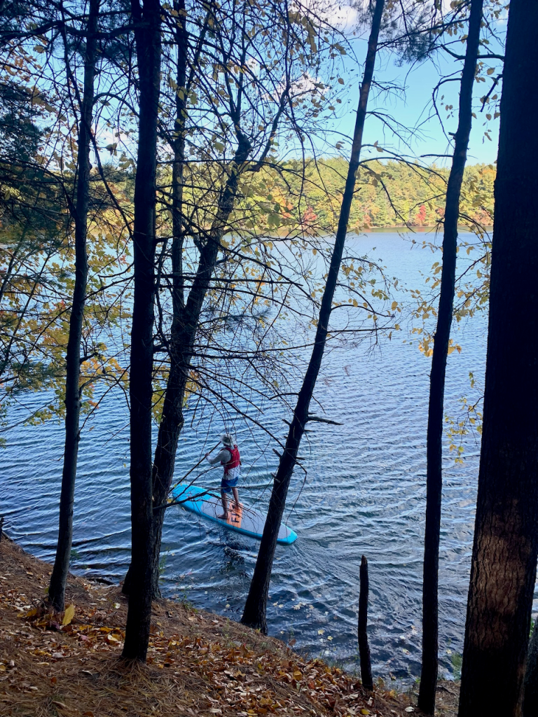 At 9:00 it was still very quiet, and we walked the 1.7 mile trail around the pond, taking in its quiet beauty. There were several people fishing, plus a few swimmers (!!!) and a lone-paddle boarder. I told David that’s something to add to his bucket list: paddle board on Walden Pond.