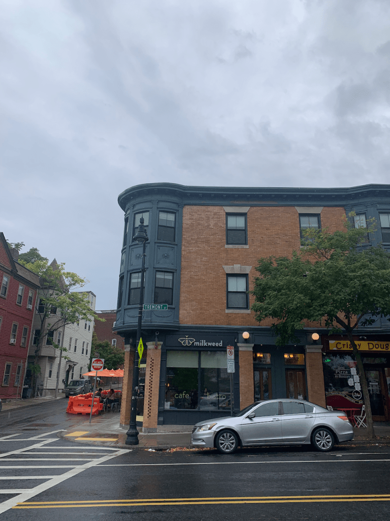 Milkweed Cafe, an upscale diner, is in a quiet neighborhood of Boston, and the food was delicious: I ordered the avocado bacon mushroom scramble with sourdough toast.