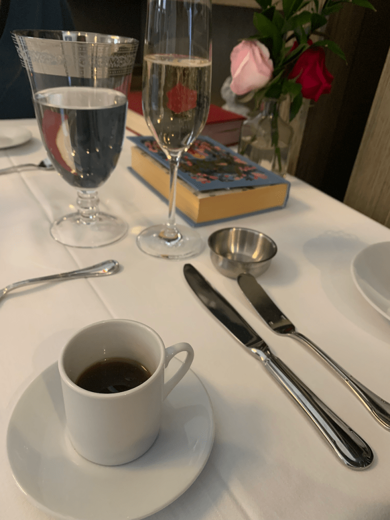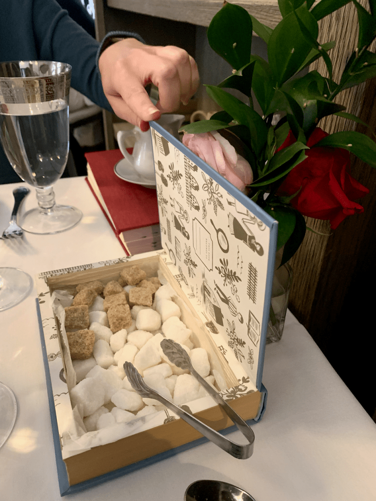 Each menu comes in a vintage book. The menu is fixed, which I much prefer because how could I ever choose? The only choice we had to make was whether we’d like a glass of champagne with our tea. Why, yes, we would.