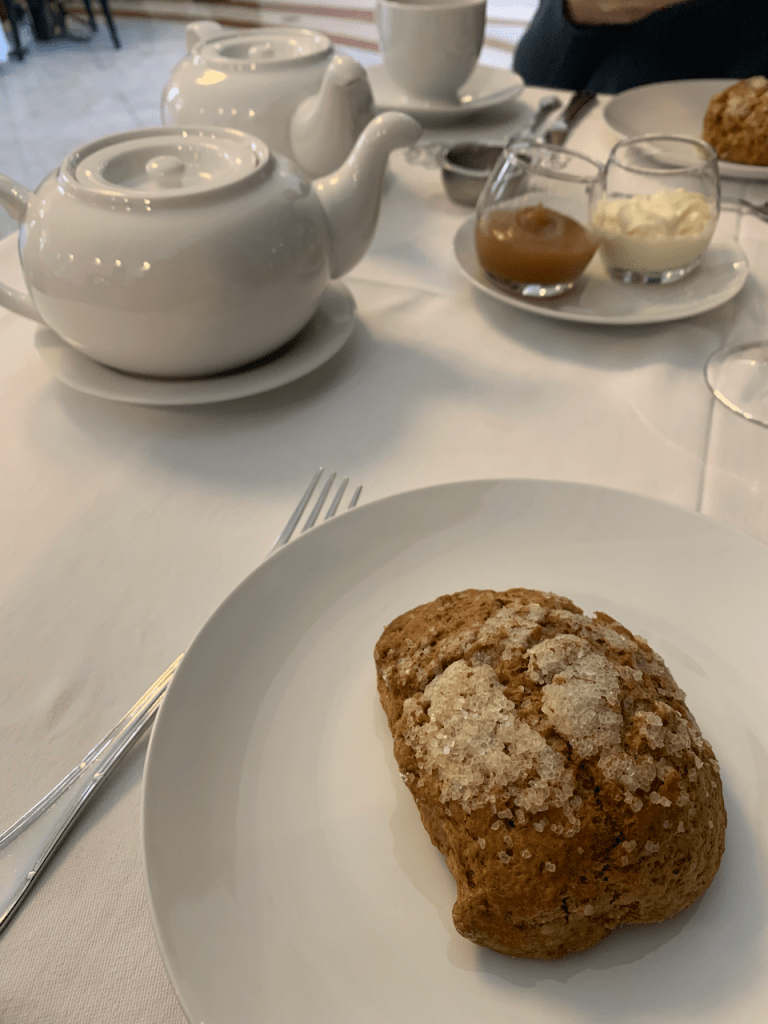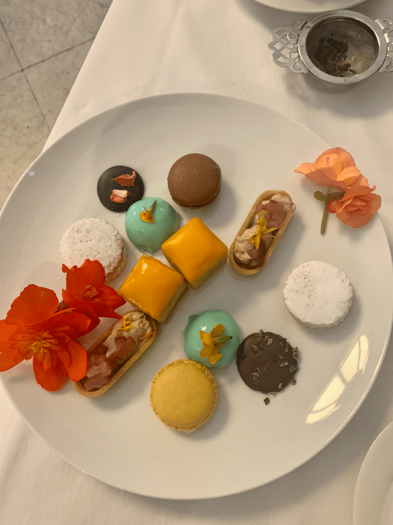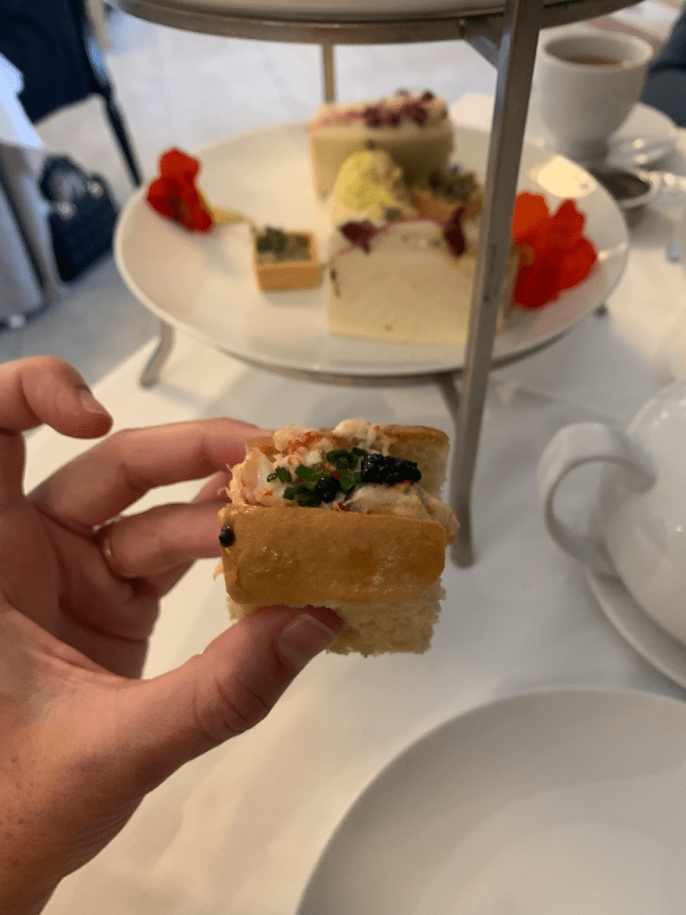Isn’t this display magnificent? Truly it does not do the food justice. It was all incredible. The lowest plate was for sandwiches and savory tarts. Then a seafood plate. And on top were our sweets.
