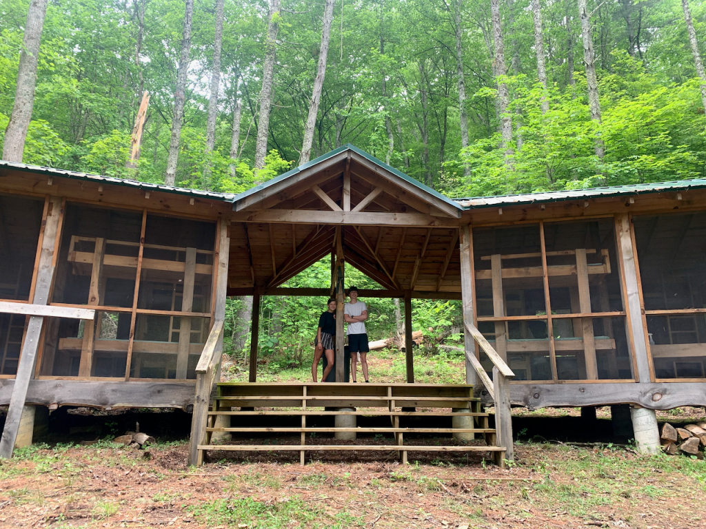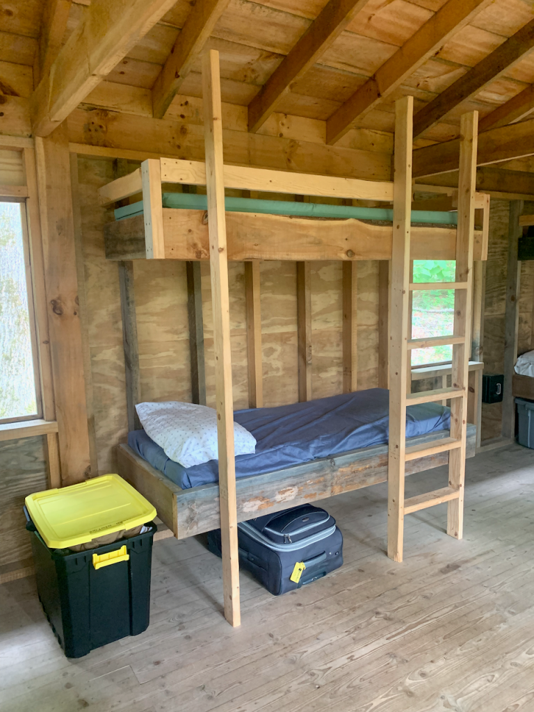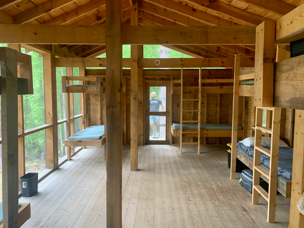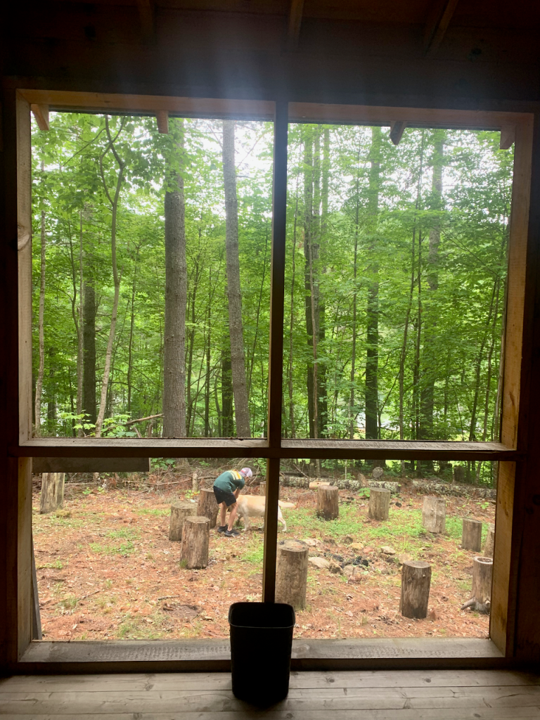 The guides are divided into these two cabins connected by a breezeway. I love the open-air wall with the lush green view (although hopefully they don’t get a crazy rainstorm. They also have their own bonfire spot in the clearing. The bathroom is back down the trail.