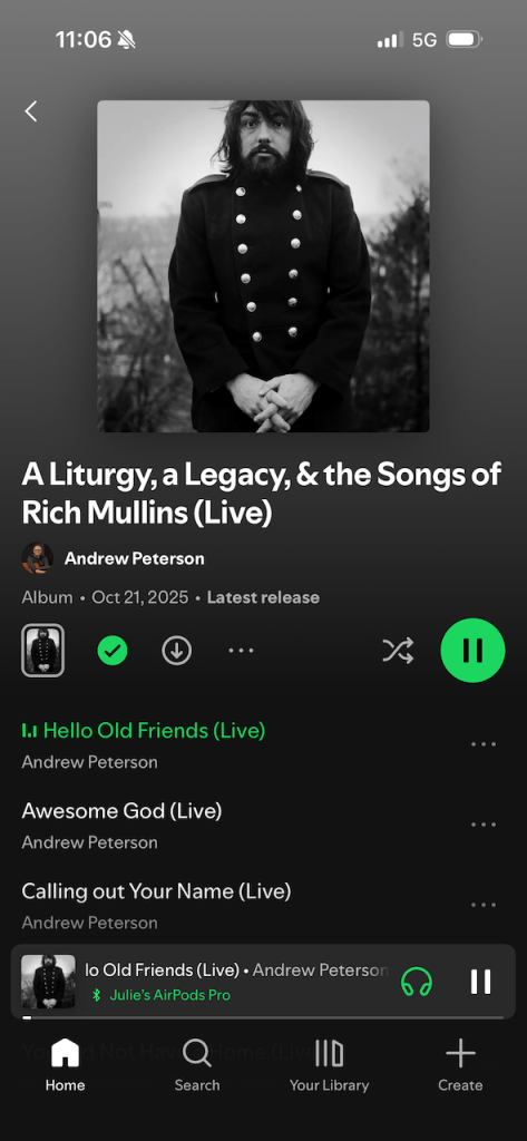 But currently, when I’m by myself I’m listening to this album on repeat. It’s two of my all-time favorite Christian musicians combined: Andrew Peterson and friends covering the songs of the late Rich Mullins.